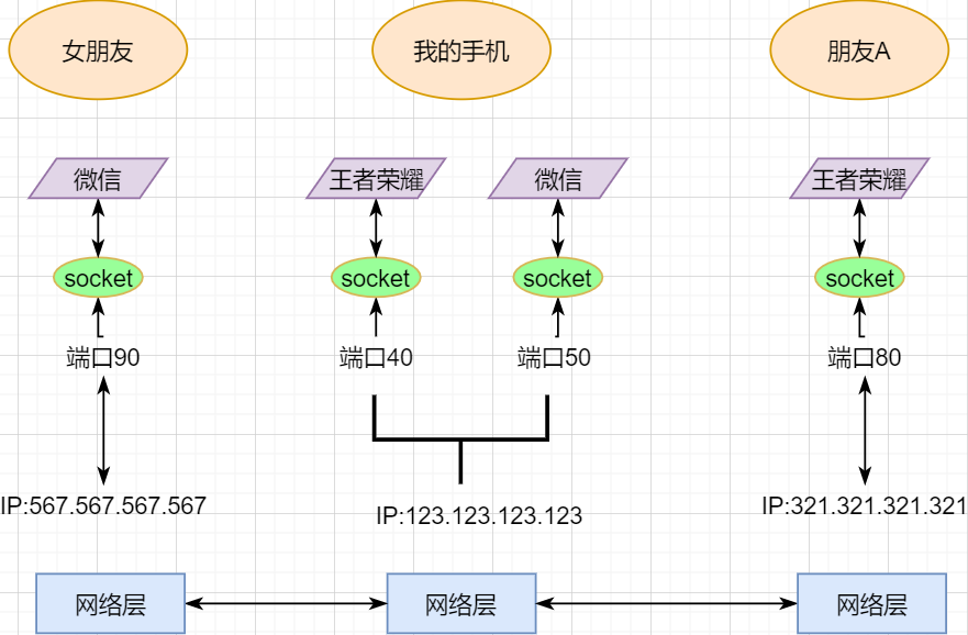 一个主机有多个进程,进程之间进行不同的网络通信,如边和朋友开黑边和女朋友聊微信。我的手机同时和两个不同机器进行通信。那么当我的手机收到数据时,如何区分是微信的数据,还是王者的数据?那么就必须在网络层之上再添加一层:运输层 :