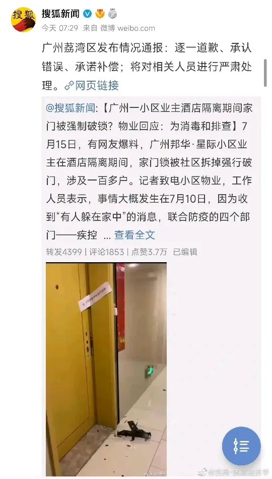 广州荔湾区海龙街道“邦华·星际”小区业主在酒店隔离期间,家里门锁被社区拆掉强行破门,共涉及84户(网友爆料为100多户),目的是找出“隐匿”在家中的密接者。这是继大上海对隔离者的家进行入户“终末消杀”之后,又一个硬核防控的“亮点”。