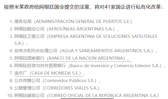 阿根廷最大的工会组织,以庇隆主义为政治意识形态的阿根廷全国总工会(CGT),以及第二大工会阿根廷工人联盟(CTA),将于1月24日,发起全国总罢工,反对米莱总统的劳动力市场自由化改革、国企改革以及削减政府开支和补贴福利。他们把米莱的国企私有化改革污蔑为“卖国”,他们说:“国家利益高于一切”,“阿根廷的土地和资产不能被放弃一寸”。米莱国企改革的核心目标,就是让企业产权明晰化,服从于消费者的需求,而不是听从阿根廷中央计划机构的命令,不断扭曲资源配置,造成生产的混乱;国企依靠纳税人的税收输血生存,是躺在纳税人身上的寄生虫,因此实施国企私有化改革,也是甩掉赤字包袱,严格财政纪律,实现预算平衡的重要战略。它也是米莱“炸毁”阿根廷央行的一个重要动作(注意看划线部分):![]()