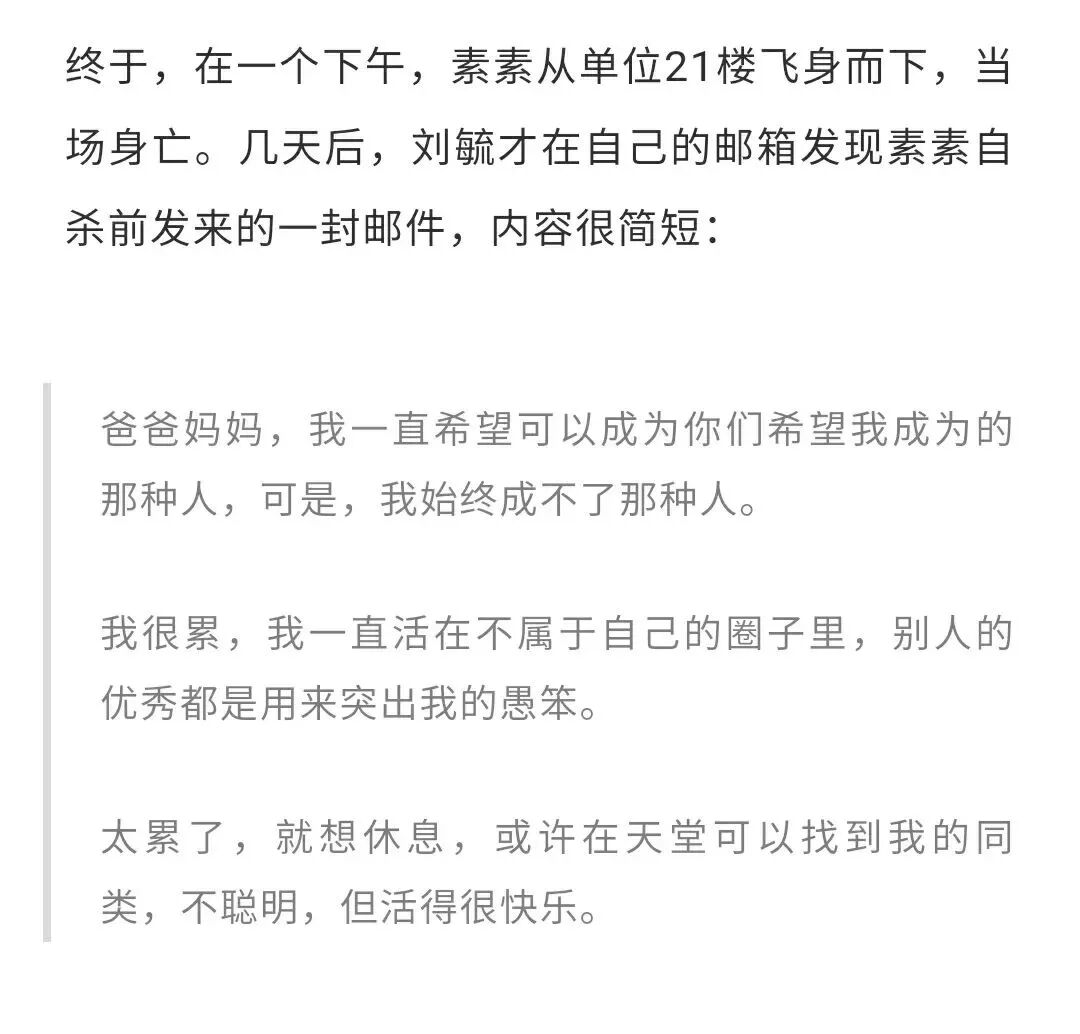 结果是素素参加工作后,依然无法完成她在工作岗位应该完成的任务,觉得自己实在没有力量支撑下去。然后她决定自杀。