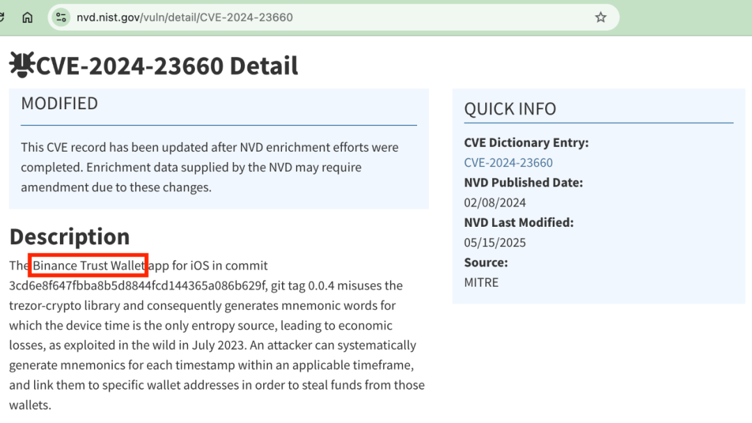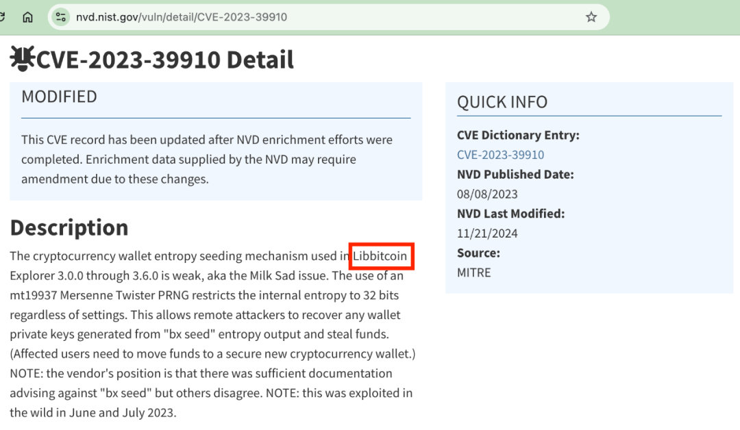 早在两年前,2023.8.15教链文章[《警惕私钥缺陷,牛奶悲伤漏洞已造成近30枚BTC被盗》]中就介绍过,被知名BTC科普大神Andreas Antonopolous写进他畅销全球的《精通比特币》(Mastering Bitcoin) 一书的著名开源BTC工具库libbitcoin,被发现其私钥生成代码有严重安全漏洞。技术细节请自行查看NIST公布的CVE-2023-39910。教链截个图,就不展开讲了。