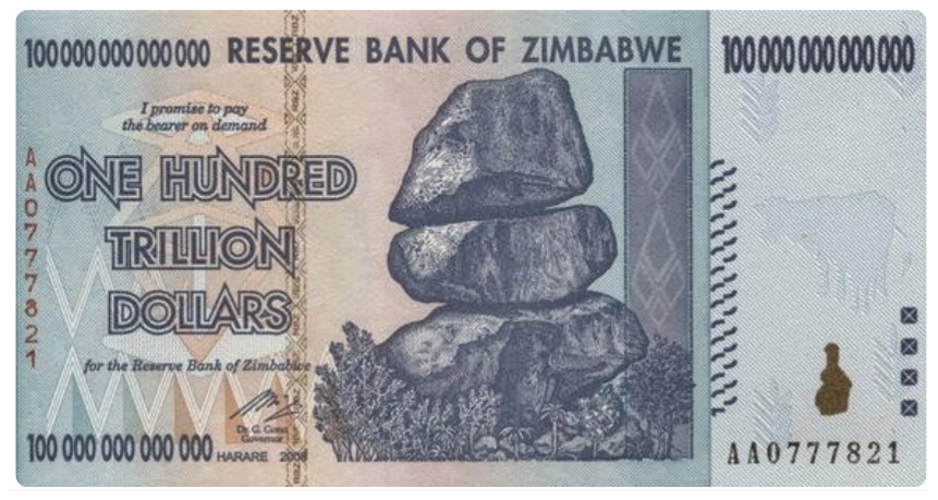 (面值100万亿的津巴布韦币)