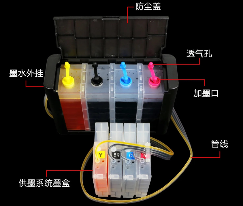 然后在机器外面放一个墨仓,往墨仓里加墨水就可以实现连续供墨。