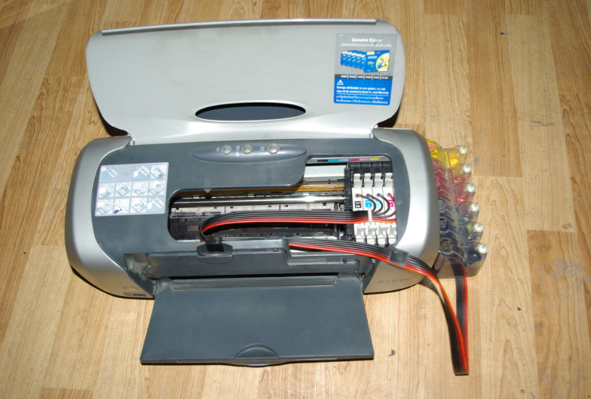 对于喷墨打印机,有种改装方法叫作“连供”,就是连续供墨系统,在原装墨盒上打孔装上输送墨水的管路。