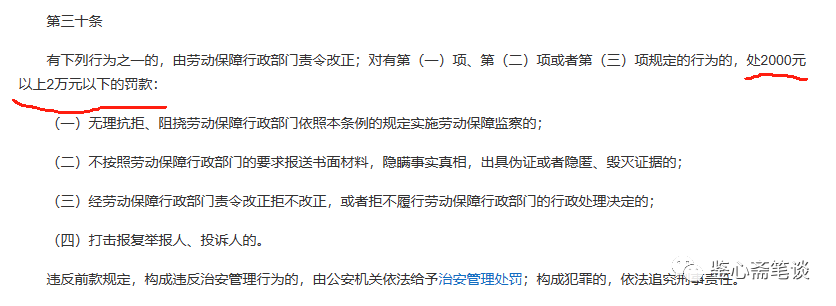 不过,根据本案网上公开的处罚依据,这样的处理结果并无问题。查询处罚依据之《劳动保障监察条例》第三十条第一款第三项可知,2000元虽少且是最低罚款,但符合条例。