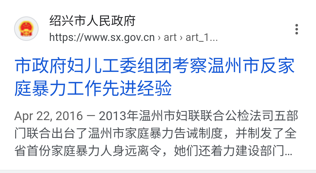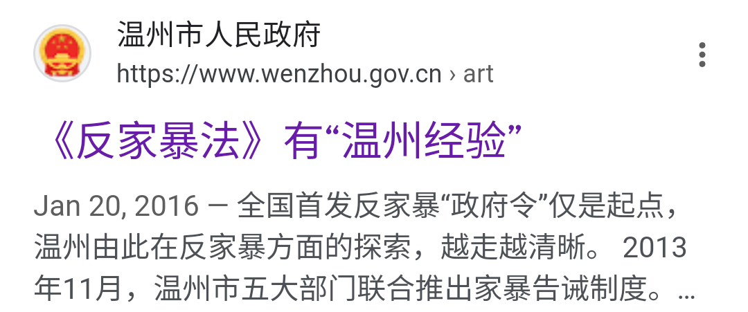 温州有没有家暴?当然有。但是在这方面,温州做得比较前沿。中国第一个反家暴政府令就是在温州做出的。温州的反家暴做得好,兄弟城市也来学习。