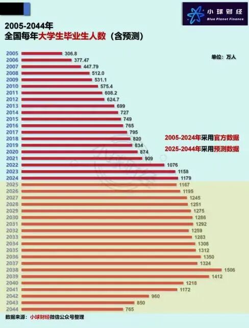 下面是一张未来20年大学毕业生的预测变化图。从图中可以看出,未来一段时间里,如果就业岗位的情况不发生质变的话,接下来的20年,大学毕业生可能都会面临就业较难的情况了。