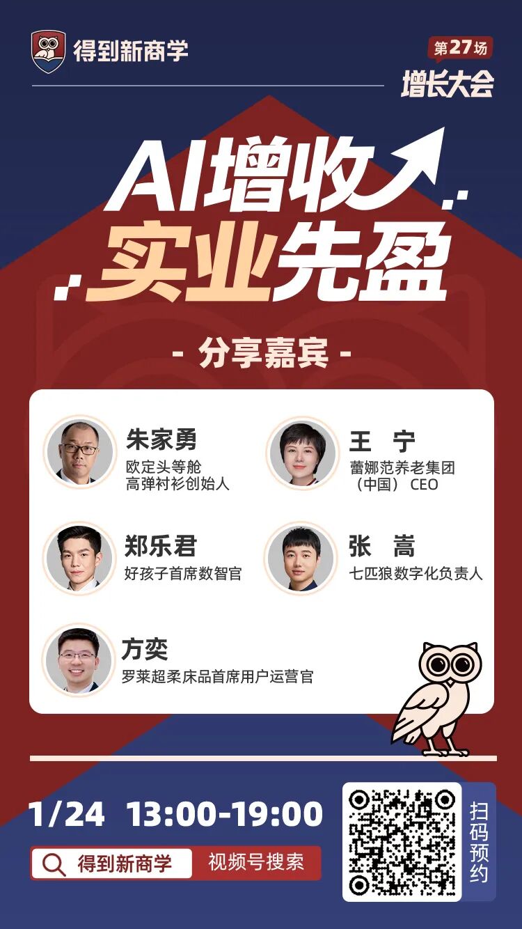 1月24日,得到新商学增长大会,请来 5 位用AI拿到真增长的实业老板。通过拆解他们的案例,帮你理清用 AI 提效增收的具体思路。