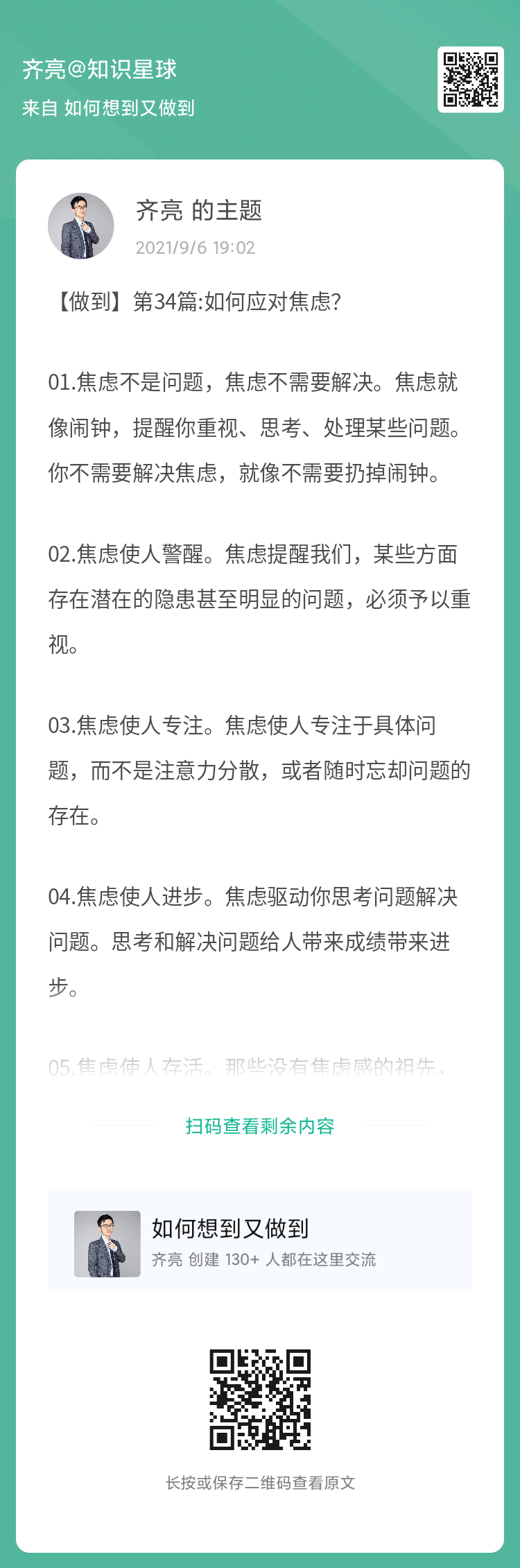 这个星球主要写关于“做到”的行动学系列(也写一些其他方面的思考)。【做到】系列目前已经更新到了36篇。我的做事心法,甚至血泪教训,毫无保留的分享给你。已经购买了星球的朋友,也欢迎留言分享你的践行经历。我会每个月继续选出践行者,赠送自己精心挑选的礼物。也欢迎你在星球向我提问,深度交流。如果你也想在这个星球上写【如何想到又做到】这一主题,总结你的做事经验,分享你的做事心法,启迪帮助他人,链接更多人脉和资源,欢迎联系我。对了,你也可以通过朋友圈、公众号分享你的学习心得,顺便分销我的知识星球。我设置的分佣比例是50%. 如果做的好,可以赚到一些买书钱。思想有时不合时宜,行动却永远给彼此以激励。知识星球见,一起想到并做到。