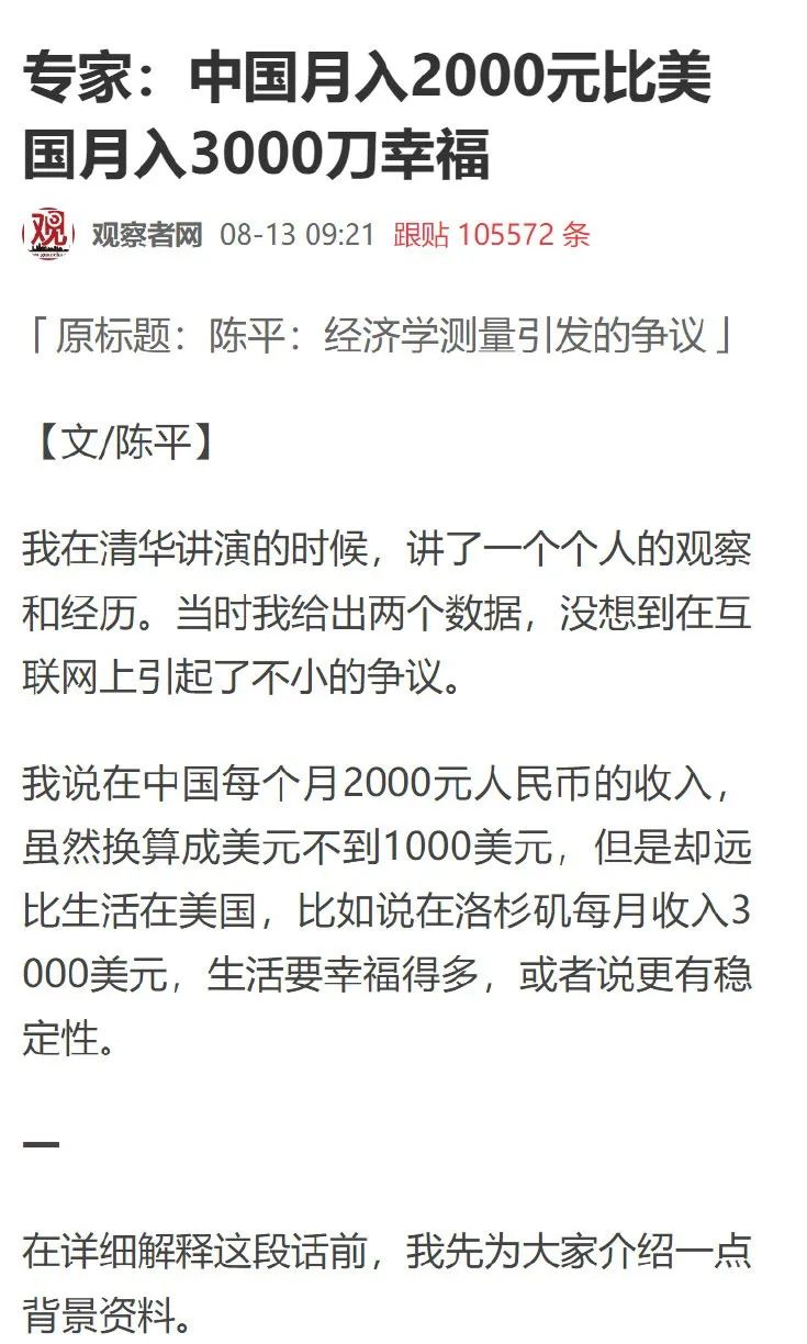 “中国每个月2000元人民币的收入,比在洛杉矶每个月3000美元的收入,生活要幸福得多。”